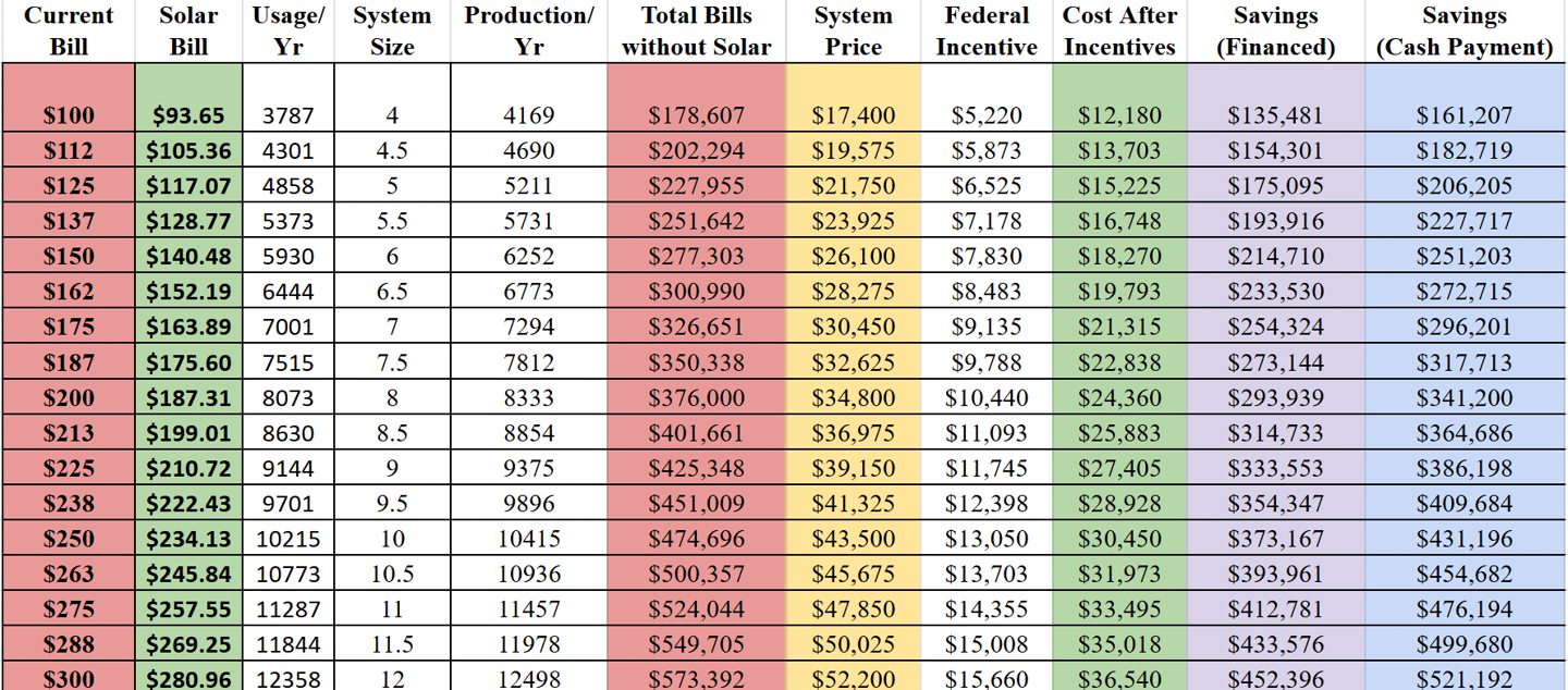 Consult Size & Savings Chart below prior to applying for your solar loan.